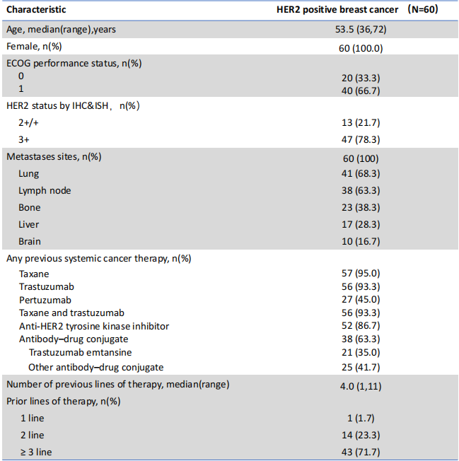 截至2024年5月,共有60名HER2阳性转移性乳腺癌患者入组(6.0 mg/kg组3名,7.2 mg/kg组57名),其中包括10例基线存在脑转移的患者。所有受试者前线治疗的中位数为4(范围1-11),93.3%的患者接受过曲妥珠单抗治疗,86.7%接受了HER2 TKIs(主要是吡咯替尼)治疗,63%接受了其他HER2 ADC(包括T-DM1、FS-1502、A166、DX126-262、DP303C、RC48、TAA013等)治疗。
