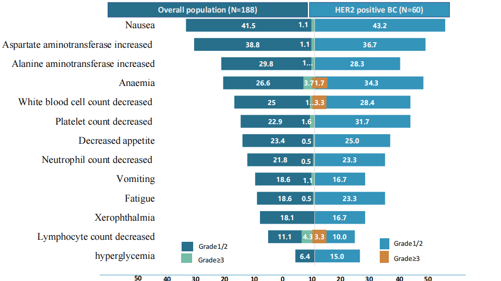 HER2阳性乳腺癌患者中≥3级的治疗相关不良事件(TRAEs)发生率为8.3%。最常见的TRAEs包括胃肠道毒性、骨髓抑制和肝功能异常,大多数为1级或2级。乳腺癌患者中观察到两例1级间质性肺病(ILD),无受试者因不良事件而减少剂量、退出或死亡。