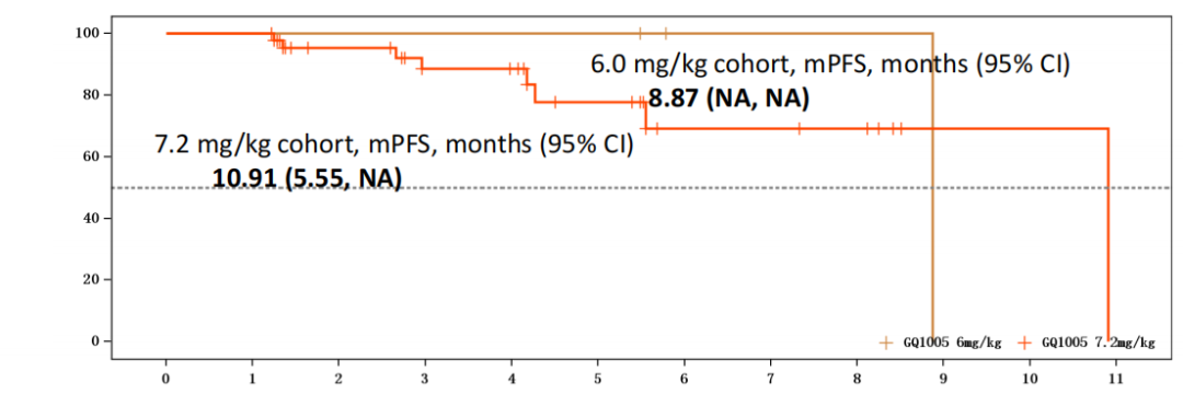 至数据截止时,49名可评估患者客观缓解率(ORR)为65.3%,确认的ORR为51%。还有7名未确认的部分缓解(PR)在随后的随访中均被确认,疾病控制率(DCR)为95.9%。在中位随访4.1个月后,7.2mg/kg剂量组的46例患者的中位无进展生存期(mPFS)约为10.9个月。