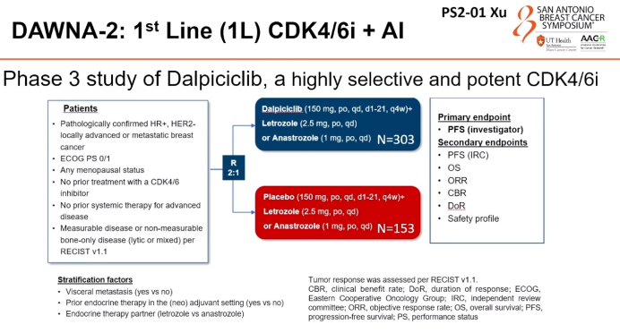 此外,徐兵河院士还在12月12日的“Poster Spotlight 2:Personalizing CDK 4/6 inhibitor therapy for patients with Metastatic Breast Cancer:Survival,QOL and biomarkers”环节分享了DAWNA-2研究的最终PFS分析结果,进一步支持达尔西利联合芳香化酶抑制剂作为当前HR+/HER2-晚期乳腺癌患者(无论绝经状态如何)的一线治疗方案。