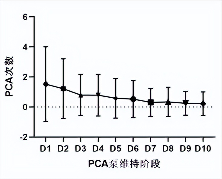 图2.“PCA简易模式”维持阶段,D1-D10爆发痛发生次数逐渐下降(P>0.05)