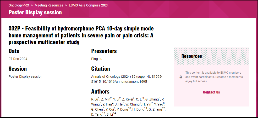 P.Lu,Z.Min,Y.Ji,et al.Feasibility of hydromorphone PCA 10-day simple mode home management of patients in severe pain or pain crisis:A prospective multicenter study.2024 ESMO Asia 532P.Annals of Oncology(2024)35(suppl_4):S1595-S1615.10.1016/annonc/annonc1695