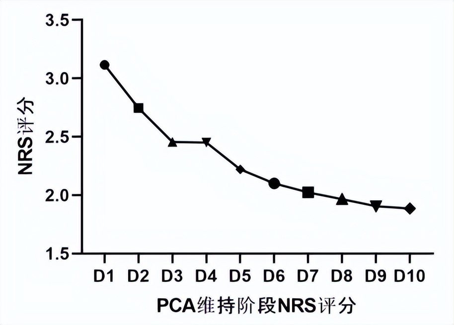 图3.“PCA简易模式”维持阶段,D1-D10患者平均NRS评分逐渐下降(P>0.05)