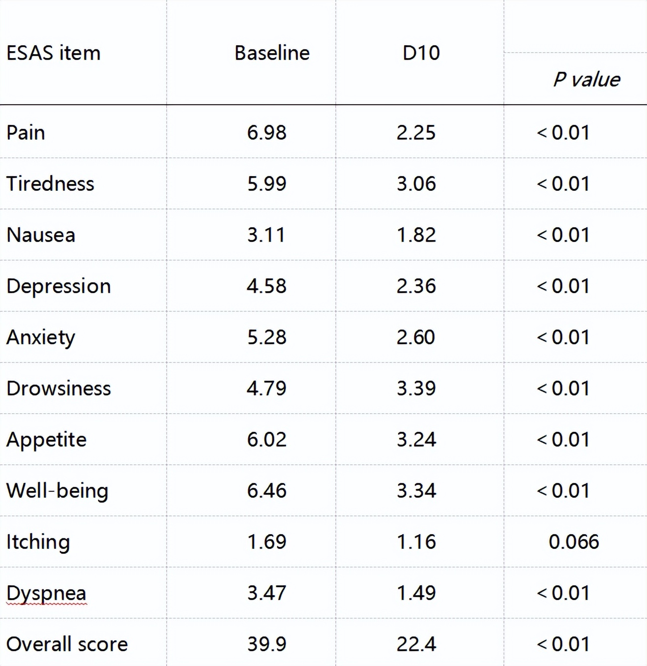 图5.治疗后各项埃德蒙顿症状评分(ESAS)均较基线显著降低(P<0.001)