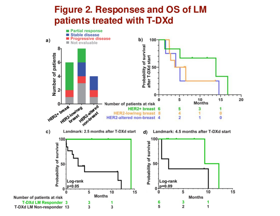 2024年SABCS大会则报道了一项更大样本的回顾性研究[14],纳入了18例软脑膜转移的实体瘤患者,包括6例HER2+乳腺癌、8例HER2低表达或阴性乳腺癌、2例HER2+胃食管癌、2例HER2突变型非小细胞肺癌(NSCLC)。研究结果显示,分别有4/6例(67%)例HER2+乳腺癌、2/8例(25%)HER2低表达/阴性乳腺癌达到部分缓解(PR)。开始使用T-DXd后(即未计算既往治疗的OS)的中位OS为5.8个月。与HER2低表达/阴性乳腺癌和HER2变异型非乳腺癌患者相比,HER2+乳腺癌患者的OS更长(13.9 vs 5.2 vs 4.6个月)。Landmark分析显示,在2.5个月内对T-DXd治疗出现影像学软脑膜应答的患者OS更长(14.2 vs 2.6个月,HR 0.18,95%CI:0.05-0.63,P<0.05),且在开始使用T-DXd后3.5个月和4.5个月的Landmark分析中也显示出类似的趋势。