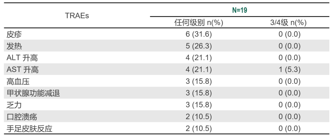 安全性方面,19例患者报告了任意级别不良反应。仅1例患者报告3/4不良反应。