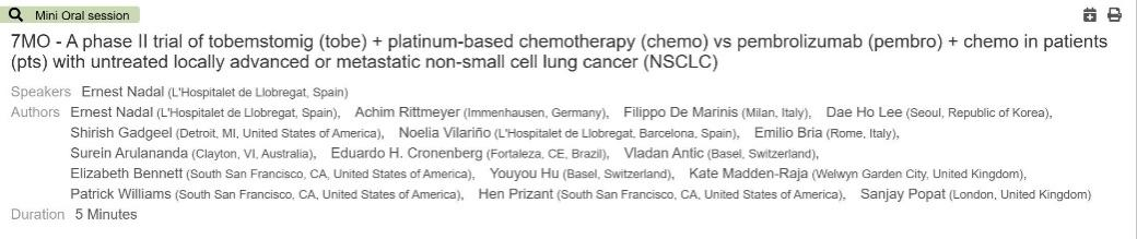 在本次数据分析时,Tobemstomig联合化疗相较于帕博利珠单抗联合化疗并未改善ORR和PFS,OS数据不成熟。