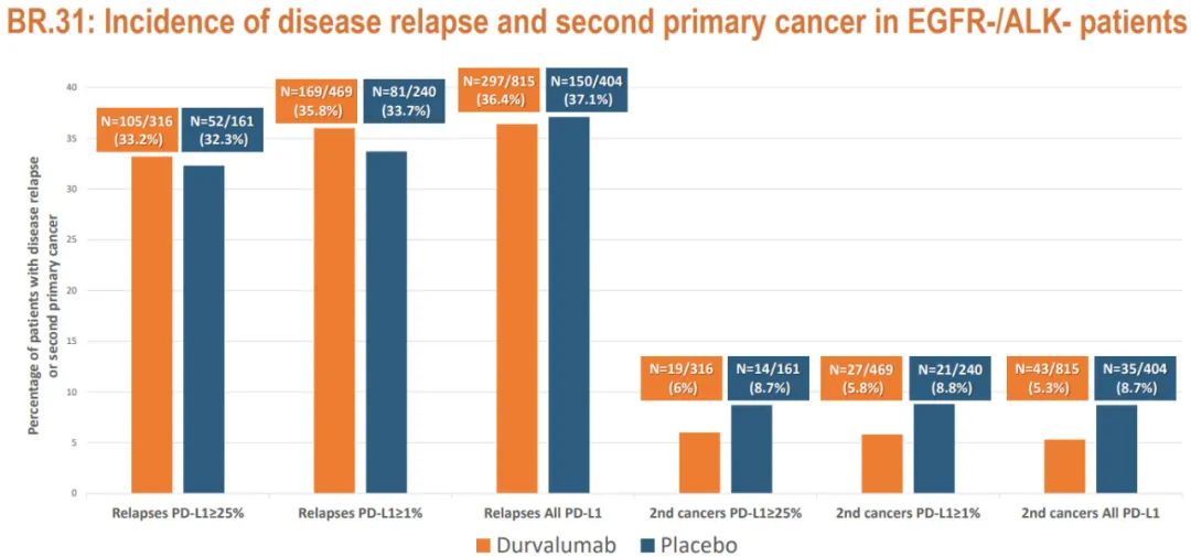 我在2025 ELCC汇报的BR.31试验结果表明:两个治疗组在复发率方面无差异,第二原发癌的发生率也无差异。两组均有约40%的患者出现复发,5%-8%的患者出现第二原发癌(辅助度伐利尤单抗未能降低复发率或改变复发模式)。