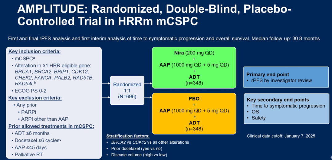 2025年ASCO年会上公布了III期AMPLITUDE试验,成为首个证明在接受PARP抑制剂联合AR通路抑制剂治疗的mCSPC伴有某些基因变异的患者中,rPFS有所改善的研究。AMPLITUDE试验评估了尼拉帕利联合AAP疗法与安慰剂联合AAP疗法的疗效。