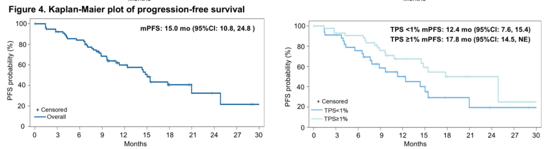 本次ASCO会议上,我们主要更新报告了81例非鳞NSCLC患者的数据,总体人群的中位PFS达到了15.0个月。这一结果令人瞩目,因为目前在非鳞NSCLC晚期一线治疗中,化疗联合PD-1免疫治疗是标准方案,其中位PFS大约为9~10个月。亚组分析显示不同PD-L1表达水平的患者均有治疗获益,PD-L1 TPS<1%、≥1%和≥50%患者的中位PFS分别为12.4、17.8和17.8个月。在ORR方面,总体人群为59.3%,PD-L1 TPS<1%、≥1%和≥50%分别为47.1%、68.1%和77.8%。安全性结果与既往报道一致,显示良好的耐受性。这项研究以其卓越的疗效数据,在今天的壁报专栏中受到了国际专家的高度关注和肯定。