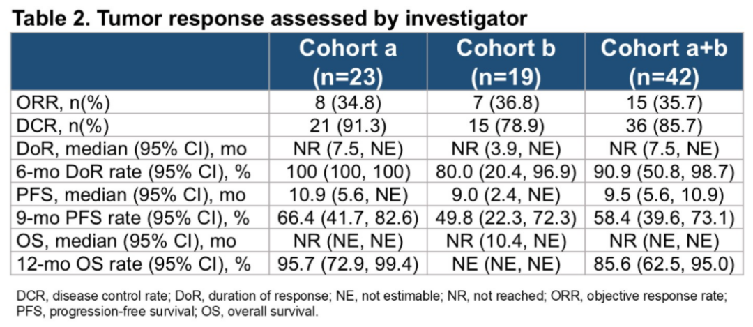 我们在本次ASCO的壁报环节中,进一步报告了针对罕见EGFR突变患者的数据,包括19例ex20ins突变(队列b)和23例非ex20ins突变(队列a:外显子18的G719X、外显子20的S768I、外显子21的L861Q点突变)两个队列。研究结果显示,总体人群的ORR为35.7%,中位PFS为9.5个月。其中,ex20ins突变和非ex20ins突变患者的ORR分别为36.8%和34.8%,中位PFS分别为9.0个月和10.9个月。这些疗效从既往已发表的其他治疗相关研究数据来看,也是非常令人惊艳的。我们期待未来能有更进一步研究探索。