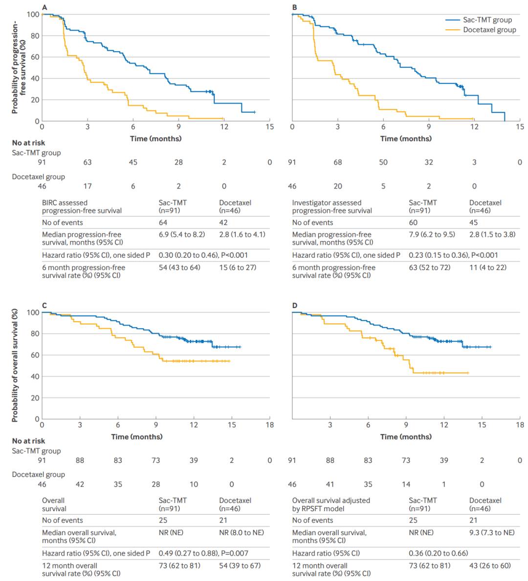 BIRC评估芦康沙妥珠单抗组和多西他赛组的ORR分别为45%(41/91)和16%(7/45),差异为29%(95%CI:15%~43%;单侧P<0.001)。
