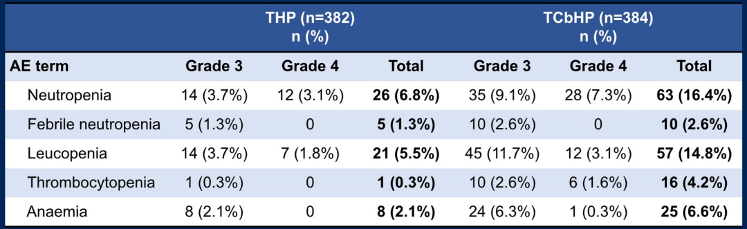 今年ASCO会议上报道的III期neoCARHP研究,就是在早期HER2+乳腺癌中进行的降阶梯治疗的探索。从目前的研究结果来看,对于早期HER2阳性乳腺癌患者,THP治疗方案的pCR并不劣于标准的TCbHP方案(64.1%vs 65.9%,差异-1.8%,P=0.0089),且THP组的耐受性有所改善,≥3级的血液学和非血液学不良事件均有不同程度减少。这些研究结果提示,“去卡铂”降阶梯THP方案是一种安全有效的新辅助治疗策略。