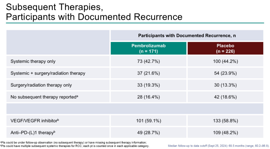 The KEYNOTE-564 trial showed an improvement in disease-free survival several years ago,and more recently,an improvement in overall survival.With a follow-up of at least five years for all patients and a median follow-up of almost six years for many,the Kaplan-Meier curves for disease-free survival remain separated,indicating a continued benefit.The overall survival benefit also persists.The safety profile shows no new safety events after more than three years of follow-up.Importantly,we analyzed patients in both the pembrolizumab and placebo arms who had recurred and looked at their subsequent treatments.We found that around 60%of patients in both arms received some form of systemic therapy,with or without local therapy such as surgery or radiation.VEGF-targeted therapy was the most common subsequent treatment,and its use was similar between patients who received adjuvant pembrolizumab and those who received placebo.