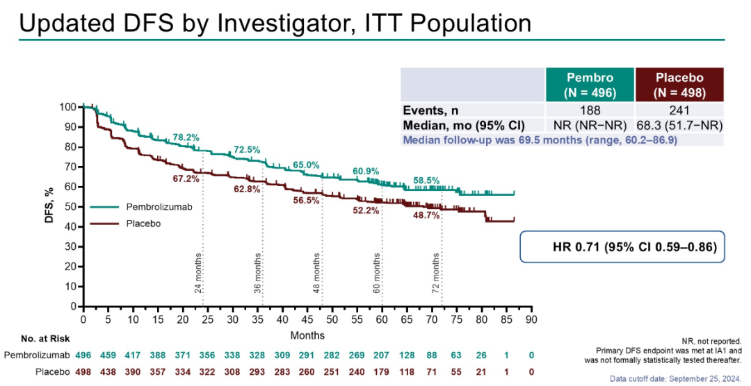 共994例患者被随机分配接受帕博利珠单抗(n=496)或安慰剂(n=98)治疗。截至2024年9月25日的数据截止日期,中位随访时间为69.5个月。所有患者在3年前完成了或停止了研究治疗。帕博利珠单抗组和安慰剂组分别发生了188例和241例DFS事件。中位DFS未达到(NR),而安慰剂组为68.3个月(HR 0.71,95%CI:0.59-0.86);5年时的估计DFS率分别为60.9%和52.2%。帕博利珠单抗组和安慰剂组分别发生了68例和99例OS事件。两组的中位OS均为NR(HR 0.66,95%CI:0.48-0.90);5年时的估计OS率分别为87.7%和82.3%。DFS和OS结果在包括预先规定的风险和肉瘤样特征在内的关键亚组中是一致的。在3年内没有报告新的严重治疗相关不良反应。