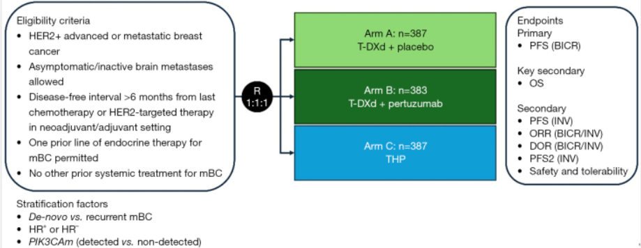 DESTINY-Breast09研究是一项随机、开放标签、多中心全球III期临床研究,纳入1,160例HER2阳性晚期或转移性乳腺癌患者,要求既往未接受过晚期阶段的系统性治疗(允许曾使用一线内分泌治疗)。受试者按1:1:1比例随机分配至三组:T-DXd联合安慰剂、T-DXd+P和标准THP方案。主要终点为盲态独立中心审查(BICR)评估的PFS。关键次要终点包括研究者评估的PFS、总生存期(OS)、客观缓解率(ORR)、缓解持续时间(DOR)、第二次无进展生存期(PFS2)及安全性等指标。
