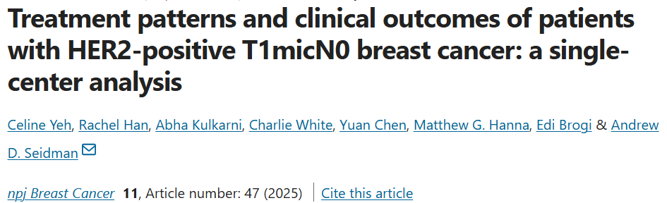 1.Yeh C,Han R,Kulkarni A,et al.Treatment patterns and clinical outcomes of patients with HER2-positive T1micN0 breast cancer:a single-center analysis[J].NPJ Breast Cancer,2025,11(1):47.