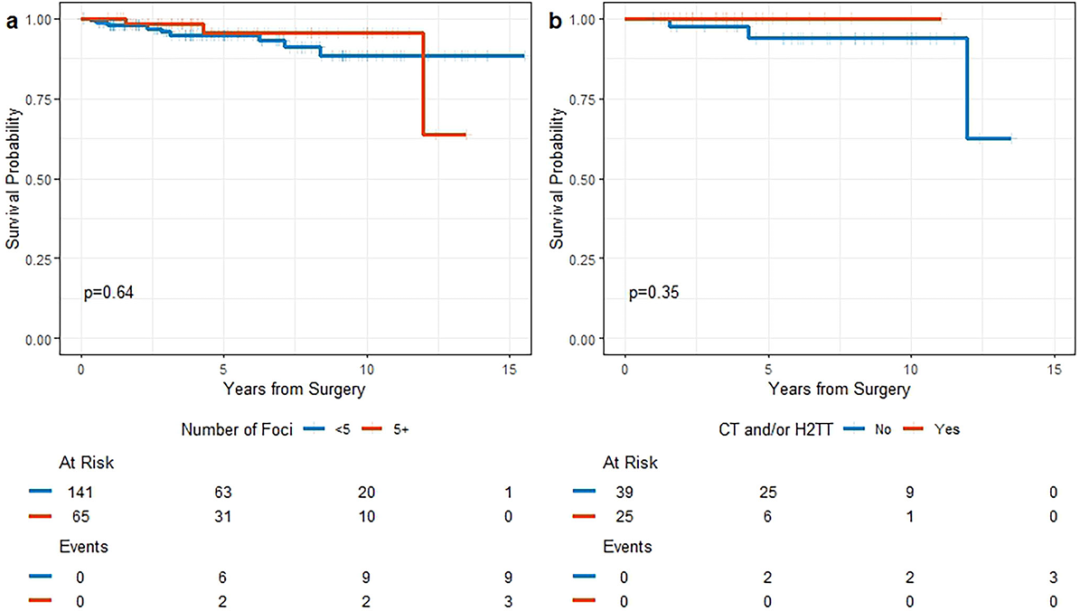 研究者检索了纪念斯隆凯特琳癌症中心病理数据库,纳入2009年1月1日至2023年9月30日期间经穿刺活检(CNB)和/或手术切除,经组织学确诊为T1micN0 HER2+[免疫组织化学(IHC)3+,或荧光原位杂交(FISH)扩增]的乳腺癌患者。排除诊断时已存在转移性(包括转移淋巴结受累,或同时/过去20年内浸润性范围>1 mm)的患者。研究结局为iDFS,定义为从手术日期到事件发生(远处或局部区域复发、新发微浸润性或浸润性、因任何原因死亡)的时间。