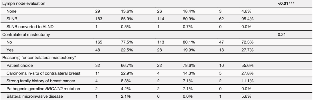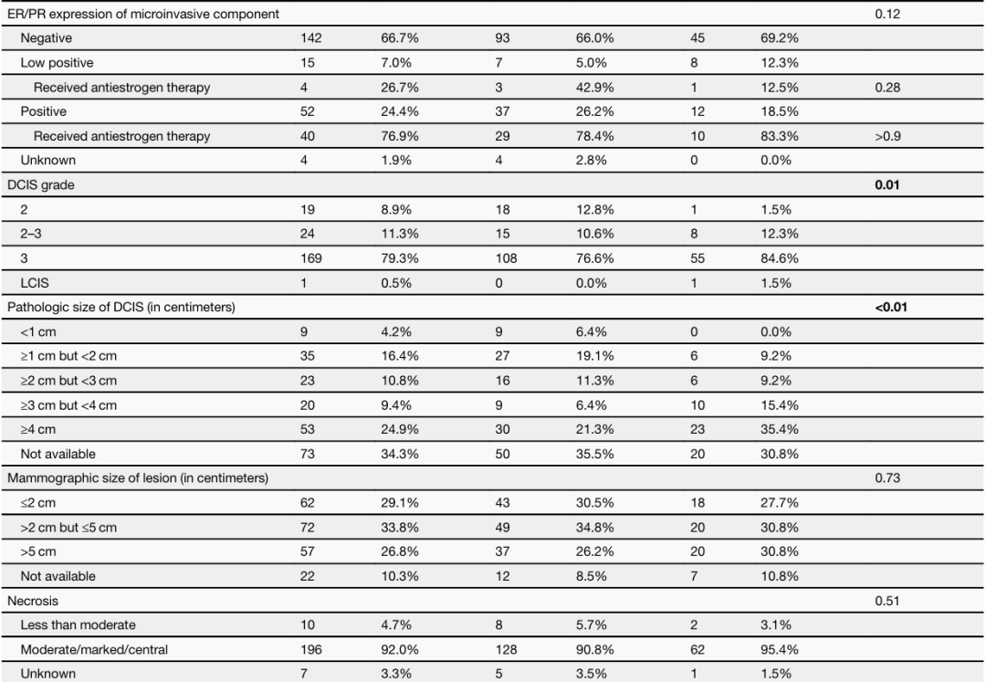 研究者最终纳入213例符合上述标准的乳腺癌患者。诊断时的中位年龄为55岁。212例患者(99.5%)为DCIS-MI,1例(0.5%)为小叶原位癌伴小叶微浸润癌。169例(79.3%)DCIS成分为高级别,伴有中度、中心性或显著坏死。211例患者(99.1%)的微浸润成分HER2 3+,2例(0.9%)为HER2 1-2+并且FISH+。155例患者(72.8%)存在多发性MI灶。85例(39.9%)患者接受了保乳手术,其中82例(96.5%)接受了辅助放疗。128例(60.1%)患者接受了全乳切除术,其中48例(37.5%)接受了对侧乳房切除术。184例(86.4%)患者接受了前哨淋巴结活检。35例(16.4%)患者接受了辅助化疗和/或HER2靶向治疗,主要方案为TH(n=33,94.3%)。52例(24.4%)为ER/PR+微浸润癌,其中40例(76.9%)接受了辅助内分泌治疗。15例(7.0%)患者为ER/PR低阳性(肿瘤细胞的1-10%)微浸润癌,其中4例(26.7%)接受了辅助内分泌治疗。