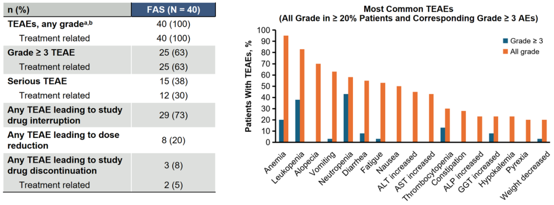 SG总体安全性可控、耐受性良好。全体患者≥3级治疗期间不良事件(TEAE)发生率为63%,较为常见的≥3级TEAE以中性粒细胞减少(43%)、白细胞减少(38%)、贫血(20%)等血液毒性为主,由治疗相关TEAE导致的停药率仅为5%(2例)