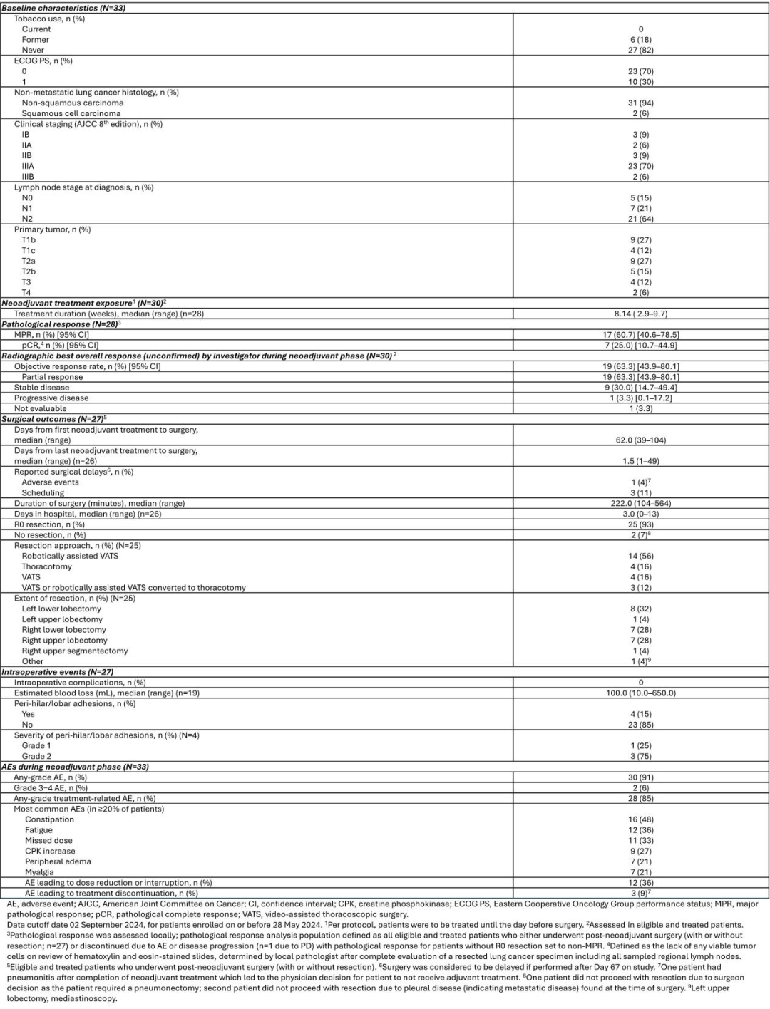 安全性结局:33例患者中,12例(36.4%)因不良事件(AEs)需进行剂量降低/中断,3例(9.1%)因不良事件停药。新辅助阿来替尼耐受性良好,未出现新的安全性信号。