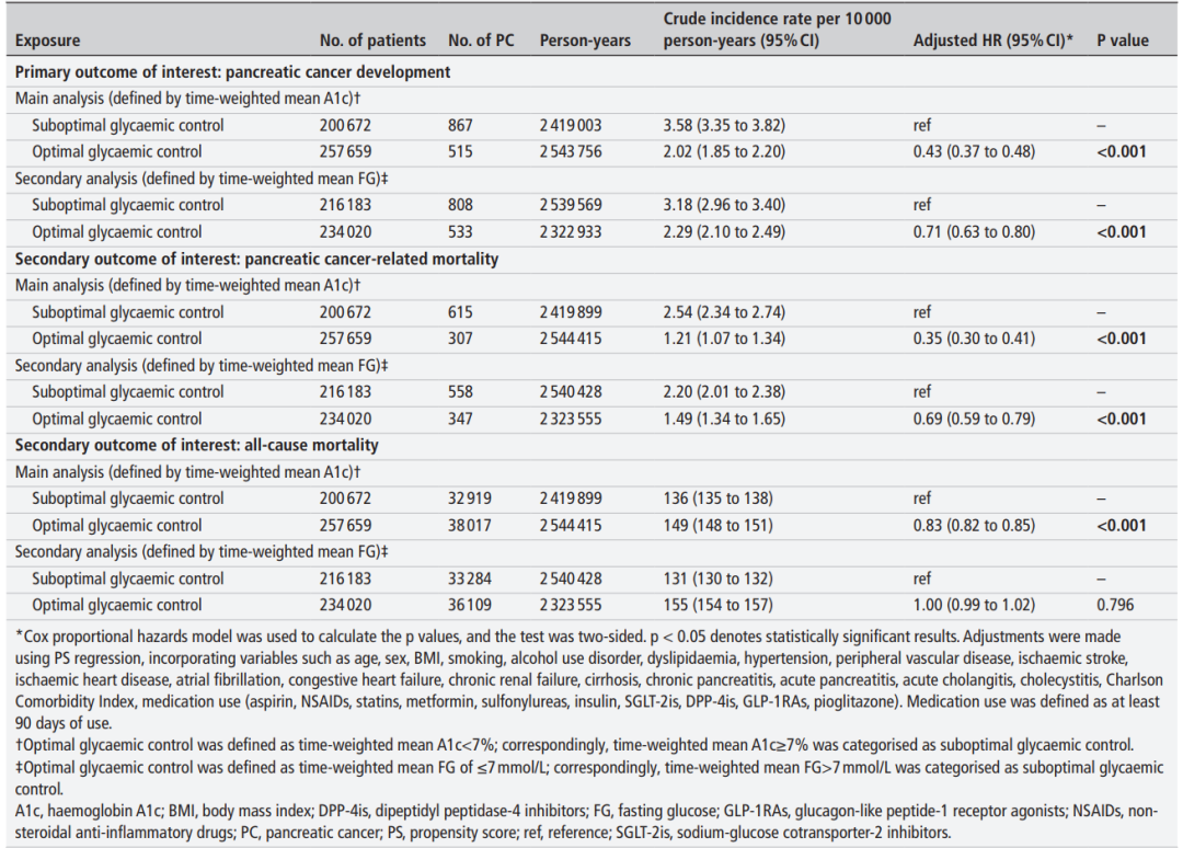 表1.血糖控制与胰腺癌发病、胰腺癌相关死亡及全因死亡之间的关联