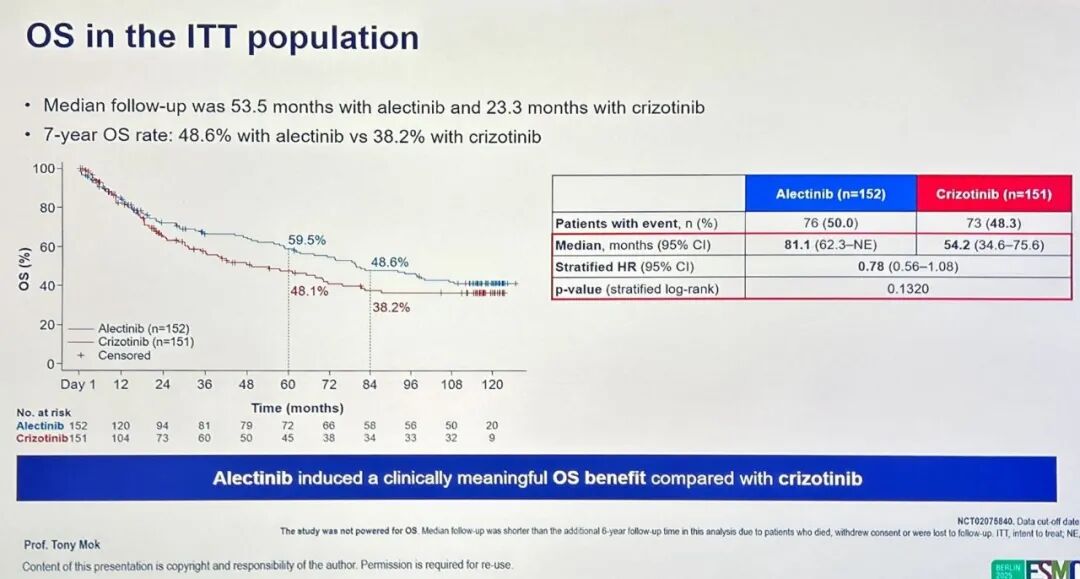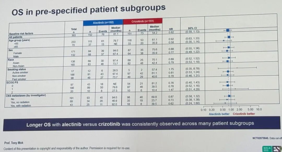 先前报告的最终PFS分析数据(数据截止日期为2018年11月30日)显示,研究者评估的阿来替尼组中位PFS为34.8个月,而克唑替尼组为10.9个月(P<0.0001)。在中位随访48.2个月时,OS数据尚不成熟,阿来替尼组的中位OS未达到,而克唑替尼组为57.4个月(分层HR=0.67;95%CI:0.46-0.98)[2,3]。在2025年ESMO大会上,香港中文大学莫树锦教授介绍了最终OS分析和自上次OS分析后额外6年随访的长期安全性数据。数据截止日期为2025年4月28日。