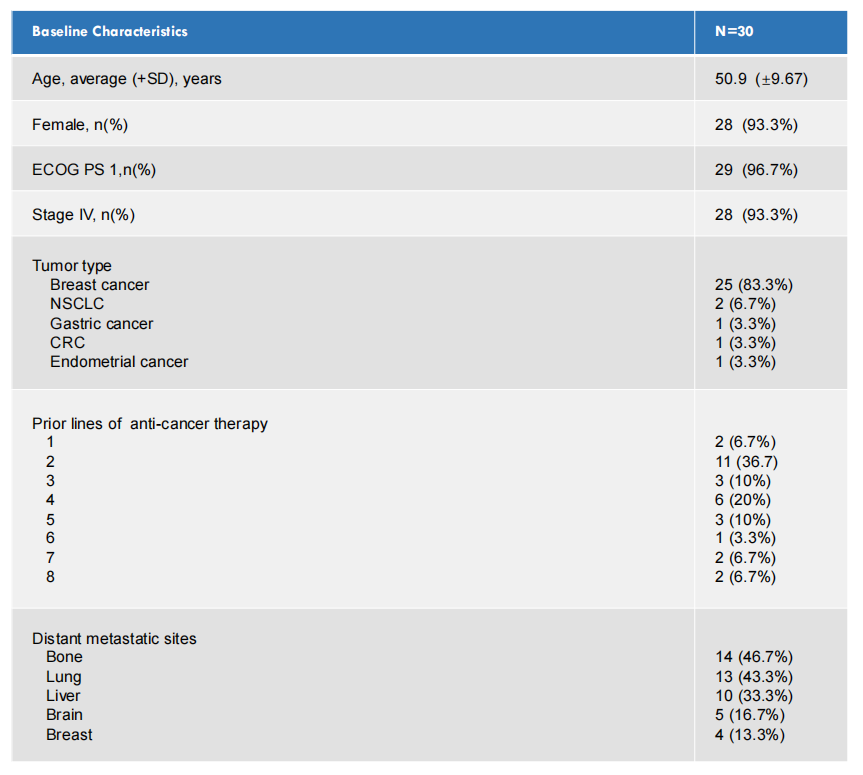 截至2025年7月23日,共纳入30例HER2表达或HER2突变实体瘤患者。平均年龄(50.9±9.67)岁。其中女性28例。肿瘤类型:乳腺癌25例,非小细胞肺癌2例,胃癌、结直肠癌、子宫内膜癌各1例。21例(70%)患者在入组前接受过ADC治疗。