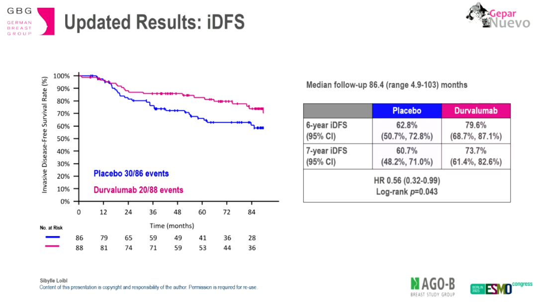 II期的GeparNuevo临床试验评估了在早期三阴性乳腺新辅助化疗的同时,加用免疫检查点抑制剂度伐利尤单抗的价值。尽管加上度伐利尤单抗后,主要研究终点pCR率并没有得到显著提升,但在次要研究终点,包括无浸润性疾病生存(iDFS),无远处复发生存(DDFS)及总生存方面,与安慰剂相比,度伐利尤单抗显著改善了患者生存。此次为更新的长期随访结局报告。