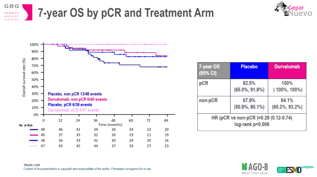 在达到pCR的患者中,试验组7年OS率为100%,对照组为82.5%(P=0.0053)。