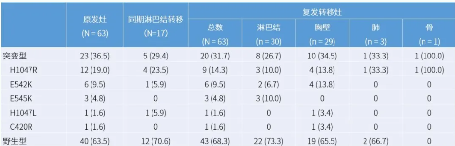 展示各部位原发和转移灶中PIK3CA突变及主要热点分布情况。