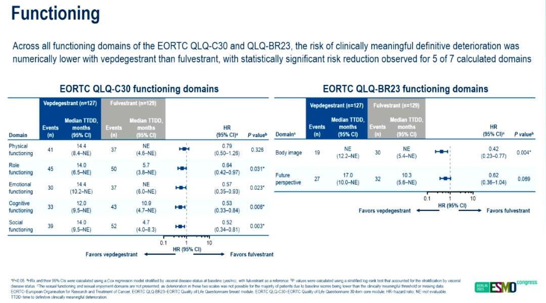 研究结果的临床意义尤为突出。一方面,Vepdegestrant与氟维司群均能维持患者健康相关生活质量(HRQoL),证实了Vepdegestrant在提升疗效的同时并未增加患者症状负担;另一方面,Vepdegestrant在PROs多维度指标的“至明确恶化的时间(TTDD)”上表现更优,意味着其能更久地延缓患者生活质量下降,这对于需长期管理的转移性乳腺癌患者而言是一项重要获益。