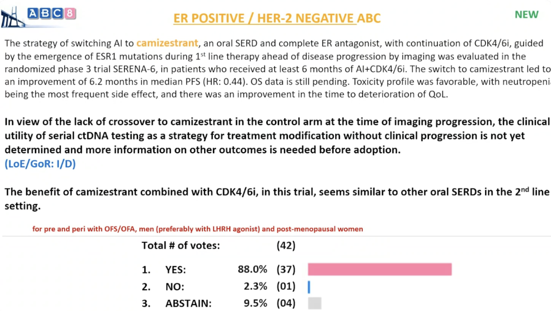 在一线治疗期间、影像学进展出现之前,若通过检测发现ESR1突变,可将芳香化酶抑制剂更换为camizestrant(一种口服SERD和完全雌激素受体拮抗剂),并继续使用CDK4/6i。这一治疗策略在III期SERENA-6试验中进行了评估,研究对象为接受至少6个月AI+CDK4/6i治疗的患者。更换为camizestrant可使中位PFS延长6.2个月(HR 0.44)。OS数据尚未成熟。该方案安全性良好,最常见不良反应为中性粒细胞减少,且可延迟生活质量恶化的发生时间。