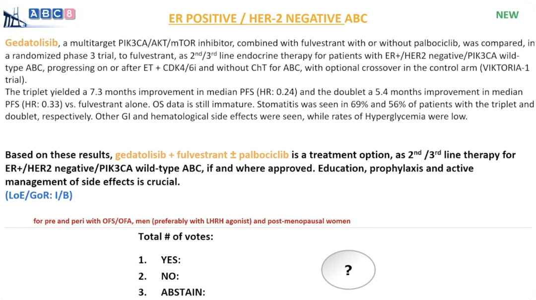 编者按:第八届晚期乳腺癌国际共识会议(ABC8)于当地时间2025年11月6~8日在葡萄牙里斯本举行。ABC共识指南是晚期乳腺癌领域首屈一指的国际性权威指南,汇聚了全球晚期乳腺癌领域的“意见领袖”级别专家,基于最新的循证医学证据对前沿和热议话题进行投票以达成共识,为全球晚期乳腺癌临床实践的革新和规范提供指导意见。肿瘤瞭望对ER+/HER2-晚期乳腺癌诊疗章节的专家意见和投票结果整理如下。