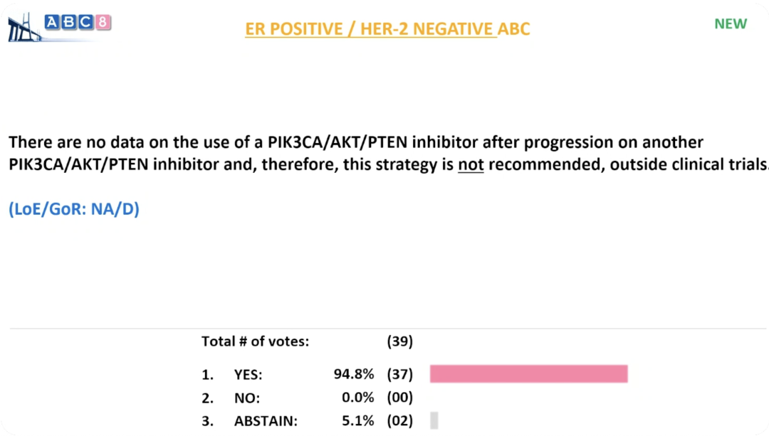 目前尚无数据支持在一种PIK3CA/AKT/PTEN抑制剂治疗进展后换用另一种同类抑制剂,因此,在临床试验之外,不推荐采用该治疗策略。