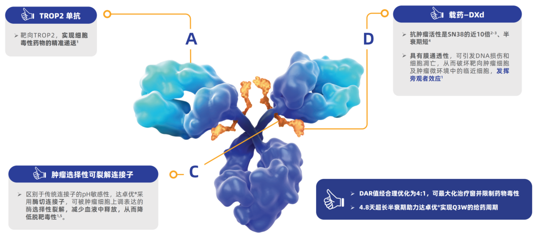 在连接子方面:Dato-DXd采用可裂解的GGFG四肽连接子,在血液循环中保持稳定。与传统TROP2 ADC的pH敏感性连接子不同,该连接子仅在进入肿瘤细胞后被酶切解离,避免了细胞毒载荷提前脱落,减少了血液循环的释放,稳定性更高,避免了脱靶毒性。