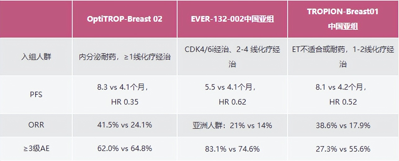 表1.HR+/HER2-mBC中三款TROP2 ADC在中国人群中的研究结果汇总(非头对头研究,请谨慎对比)