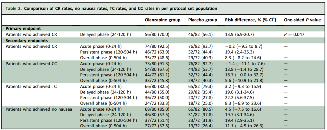 在预试验与文献数据的基础上,研究假设延迟期CR率在安慰剂组为35%,奥氮平组为50%,主要疗效分析集为按方案治疗人群(PPS),使用Fisher精确检验比较延迟期CR率,次要终点采用相应的风险差和置信区间估计,时间到事件类指标采用Kaplan-Meier方法描述。