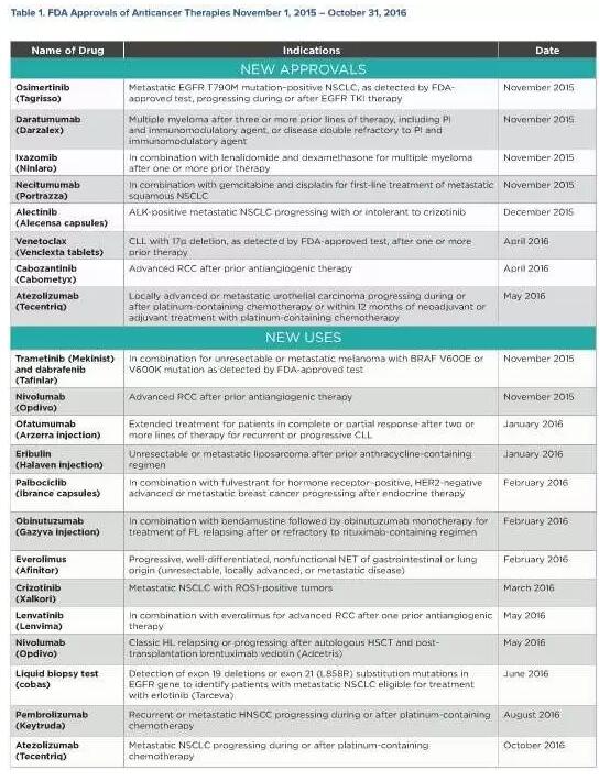 FDA批准的抗癌疗法(2015年11月-2016年10月)
