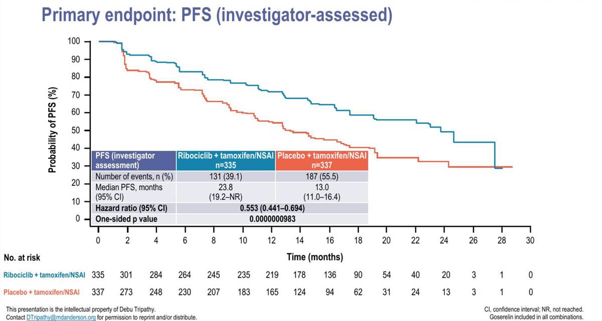 研究共入组晚期患者672例,1:1随机分配进入Ribociclib组(n=335)或安慰剂组(n=337),两组均以他莫昔芬(20 mg/d)+OFS或NSAI(来曲唑2.5mg/d,阿那曲唑1mg/d)+OFS为基础用药。分层因素包括:肺转移或肝转移、既往治疗、内分泌联合药物类型。