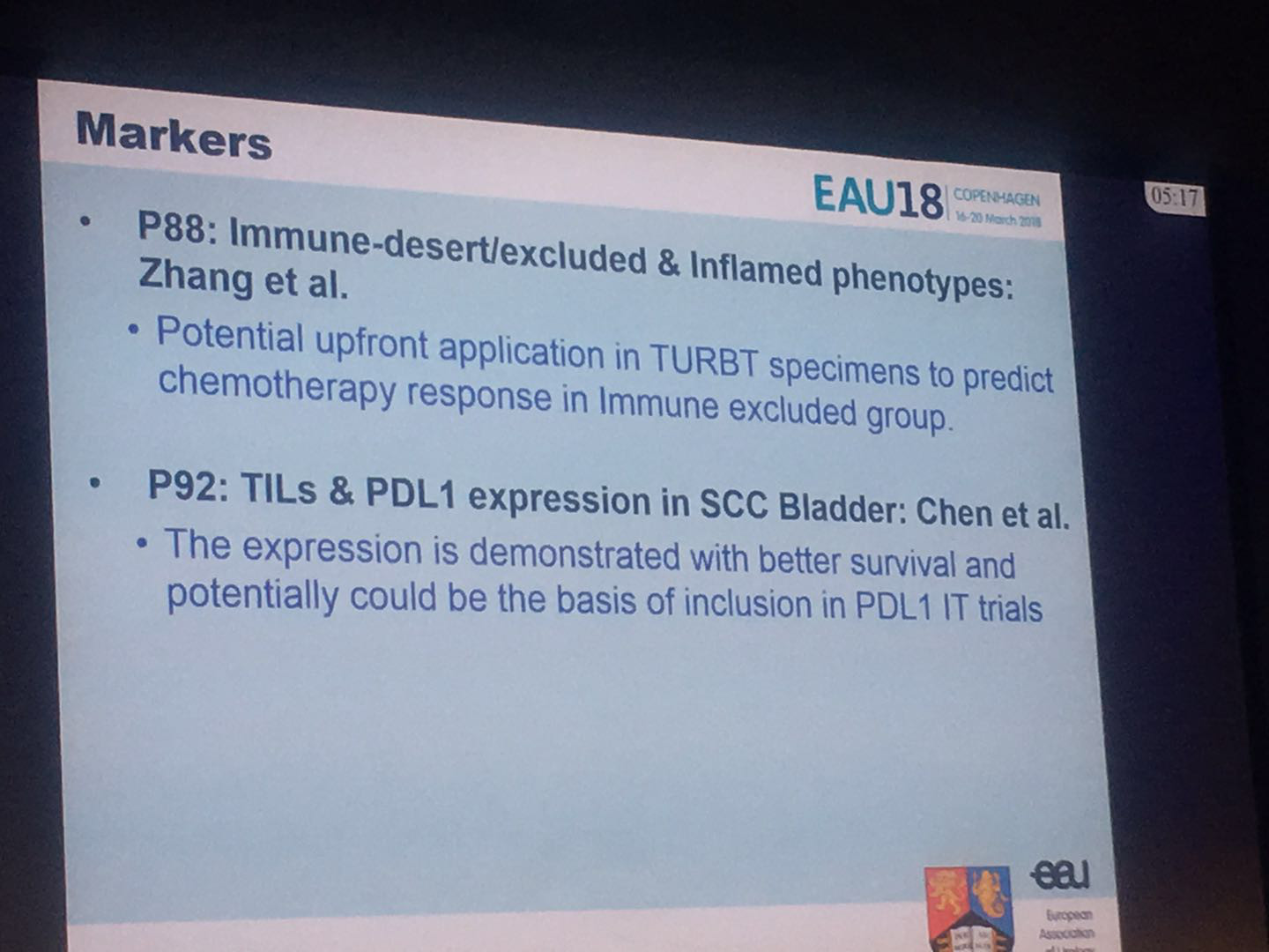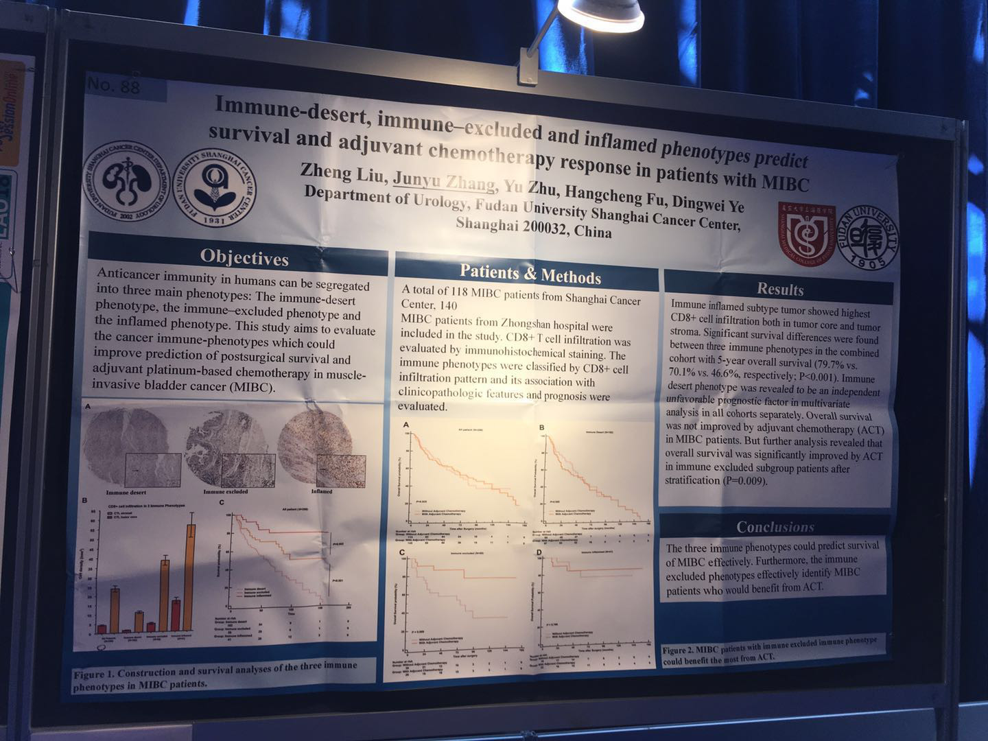 在第33届EAU年会复旦大学附属肿瘤医院叶定伟教授团队提出肌层浸润性膀胱癌中的三种肿瘤免疫分型概念:即免疫沙漠型、免疫豁免型和免疫炎症型,分析了来自两家不同临床中心的258名肌层浸润性膀胱癌患者,并建立模型评估三种免疫分型对患者预后及术后化疗敏感性(Poster No.88)。
