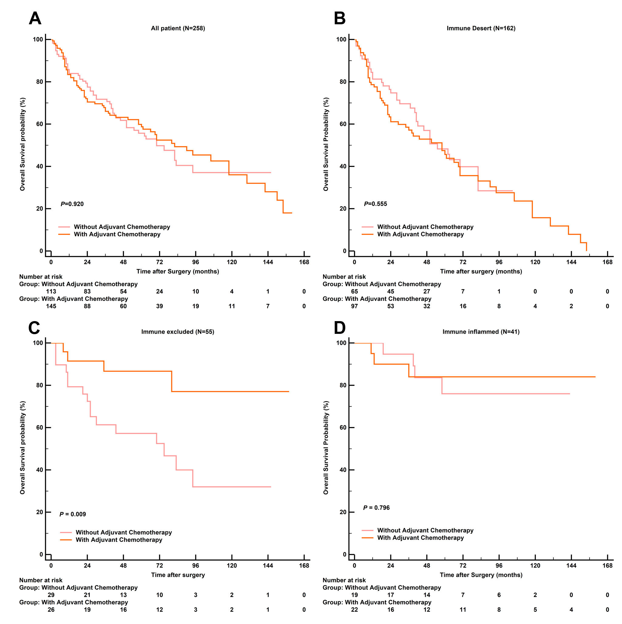 研究进一步对三种免疫分型患者的术后化疗反应性进行分析比较。在总体队列中,术后化疗对于患者的术后生存提升有限,但是在肿瘤免疫豁免型中,术后化疗相较于其他两型肿瘤免疫,患者对于术后化疗的反应最为明显,获益最大。