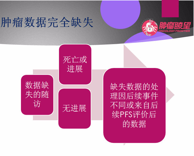 有时在出现数据缺失的随访之后紧随着的是随访发现死亡或发现进展。另一种情况是后续评价显示没有进展。对于后一种情况,继续治疗和继续监测进展证据看起来是妥当的,但是处理缺失数据的方法因后续事件而不同,并能呈现信息的删失。另一个可行的方法是包括来自后续PFS评价之后的数据。当评价频率较高并且仅有一次随访缺失时是可行的,但是当有两个或更多的随访缺失时,应在最后一次充分肿瘤评估后删失可能更合理。