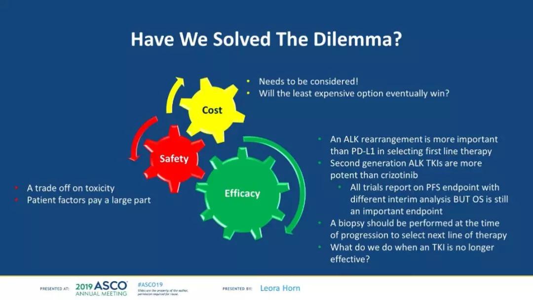 编者按:2019年ASCO,Leora Horn教授关于ALK+NSCLC的序贯治疗格局的讲课幻灯的最后一页,呈现了目前这个治疗领域的三大重要事项:疗效,安全性,以及药物经济学。Horn教授最后的发言停留在“will the least expensive option eventually win?”,再次凸显了在ALK+NSCLC领域里,治疗药物的众多给患者带来了长期生存的希望,但同时,药物经济学方面的考虑也日益重要。