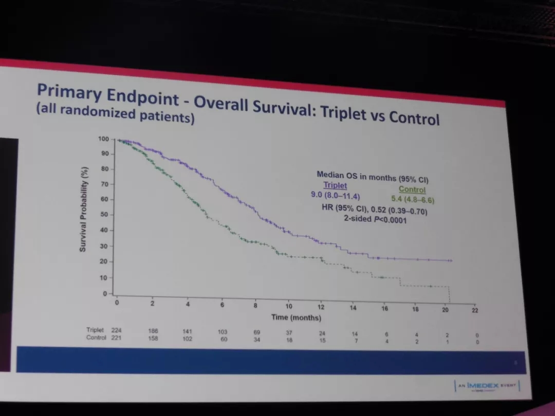 而通过垂直抑制,我们可以在EGFR和BRAF水平的不同步骤阻断相关途径,并在MEK水平进一步阻断下游相关途径。几项小型Ⅰ期和Ⅱ期研究以及BEACON的前期研究已经证实了其有效性,该研究于今年发表在临床肿瘤学杂志上,结果非常令人鼓舞,48%在BEACON前期阶段接受治疗的患者表现出缓解率和15.3个月的中位总生存期。BEACON CRC研究的完整数据在本次会议上报告。我们知道,接受三联疗法(binimetinib,encorafenib和西妥昔单抗)的患者中位总生存期为9个月,而对照组为5.4个月。就EGFR抑制剂西妥昔单抗和BRAF抑制剂encorafenib的双药联合结果而言,与对照组5.4个月的总体生存率相比,双药联合组的总体存活率为8.4个月,略低于三联疗法。因此,三联疗法似乎略微优于双联疗法,但我们仍需要通过更多的后续研究来探索毒副作用。总之,我们第一次看到针对BRAF V600E突变的个性化治疗在低风险BRAF突变的患者中带来了实际的生存获益。
