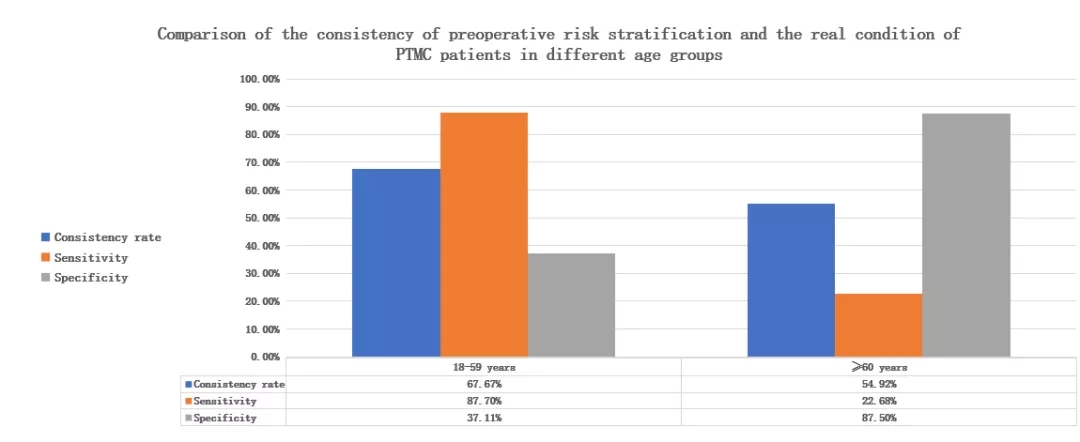 PTMC术前危险分层临床决策框架评估结果显示558例(27.9%)患者可采取积极观察,术后病理结果显示810例(40.6%)患者可采取积极观察,表明一定比例的PTMC患者可采取积极观察,而非手术治疗。PTMC术前危险分层临床决策框架敏感性82.39%,假阳性率56.91%,特异性43.09%,假阴性率17.61%,与术后病理结果的一致性66.45%,见图1[1]。进一步分层分析,结果显示18~59岁患者中,敏感度为87.7%,且甲状腺球蛋白水平高和恶性病变不伴良性结节支持手术治疗;60岁以上患者中,特异性达87.5%,但敏感性较低,术前TSH低水平支持积极观察,见图2[1]