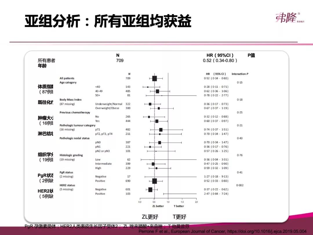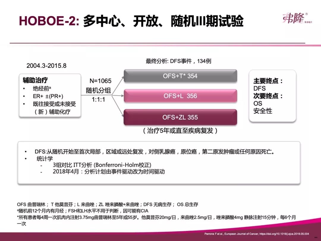 对于HR阳性的年轻患者来说,其预后较年长者差,更需要强有效的内分泌治疗。所以年轻乳腺癌患者的治疗策略也是热点议题。SOFT和ASTRRA研究都证实了TAM基础上联合OFS的价值。2018版OFS共识,对于中高危患者也推荐OFS的应用。而今年刚发表的HOBOE-2研究显示来曲唑组DFS获益,降低28%复发风险;来曲唑对比TAM组的风险比和SOFT&TEXT的AI对比TAM接近。该研究又进一步为来曲唑的应用提供了证据。