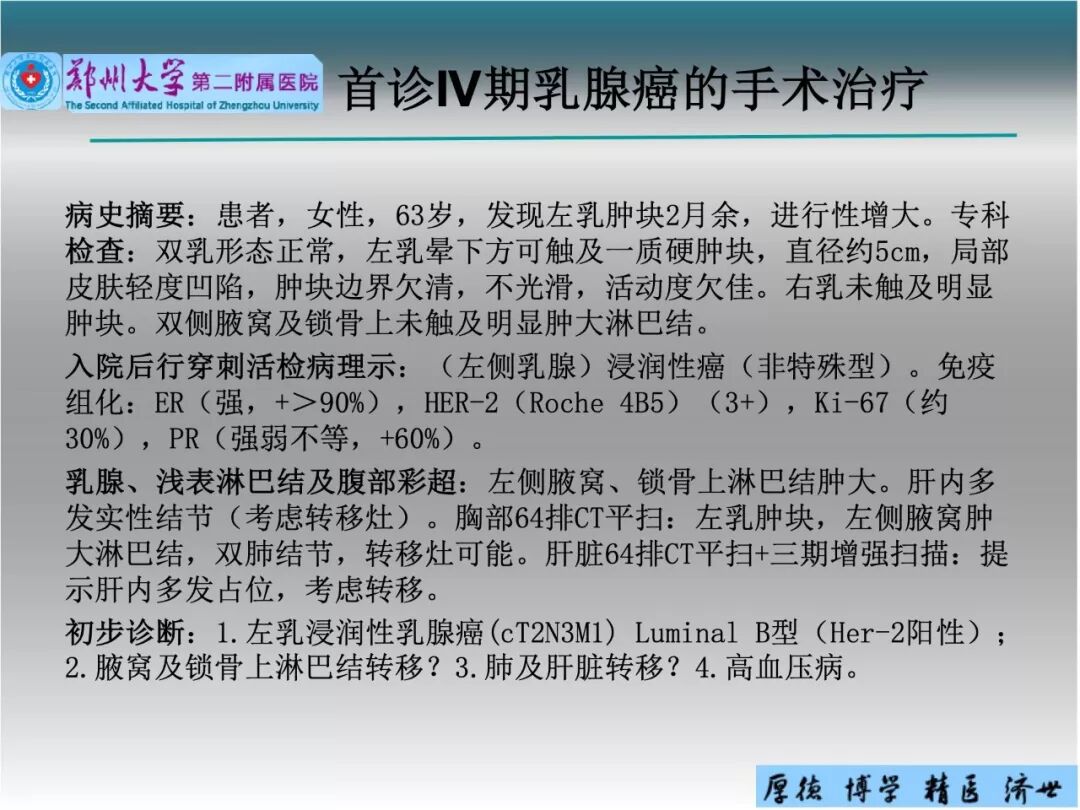 郑州大学第二附属医院的吉文仲医生介绍的是一例首诊Ⅳ期乳腺癌患者的手术治疗方案,并将通过“病理确诊”、“临床分期”、“解救治疗”、“疗效评定”、“降期后手术”、“病理分期”和“综合治疗”的诊断思路,来探讨以下两个方面问题:(1)解救治疗后的治疗选择?(2)评估效果pR,能否选择手术治疗,手术方式的选择?同时,吉文仲医生希望对“解救治疗有效后继续维持治疗OR选择手术治疗对患者远期效果的区别?”展开科研探讨。