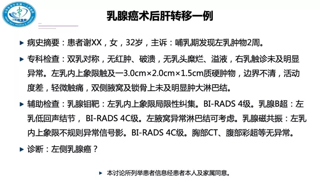 济宁市第一人民医院乳腺甲状腺外科的张国超医生介绍的是一例乳腺癌患者术后肝转移案例,并将通过“手术”、“化疗”、“内分泌治疗”、“肝转移”、“更换内分泌治疗”、“ 肝转移灶手术”和“维持内分泌治疗”的诊疗过程,提出了“乳腺癌术后肝转移全身系统治疗?Or 局部治疗?”等问题,并将深入探讨“乳腺癌术后的寡转移,适当的局部处理对患者的远期预后有无影响?”