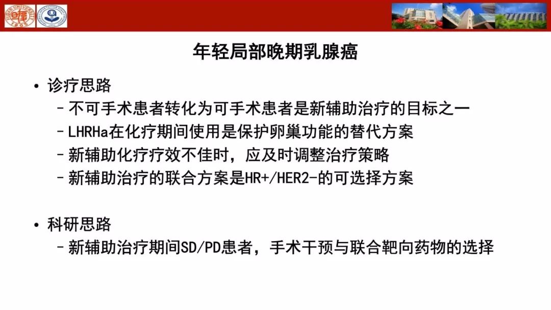 复旦大学附属肿瘤医院乳腺外科的黄亮医生介绍的是一例年轻局部晚期乳腺癌患者,并将围绕“HR+/HER2-绝经前乳腺癌患者新辅助治疗如何选择?”的问题,从以下四个方面进行分析:(1)不可手术患者转化为可手术患者是新辅助治疗的目标之一。(2)LHRHa在化疗期间使用是保护卵巢功能的替代方案。(3)新辅助化疗疗效不佳时,应及时调整治疗策略。(4)新辅助治疗的联合方案是HR+/HER2-的可选择方案。同时,黄亮医生希望在“新辅助治疗期间SD/PD患者,手术干预与联合靶向药物的选择”方面有更多的科研探讨。